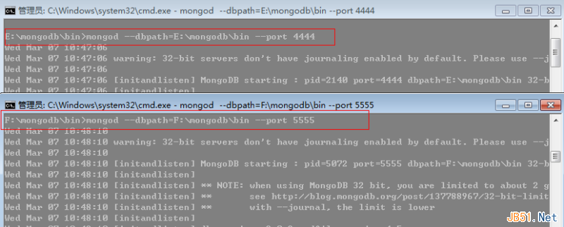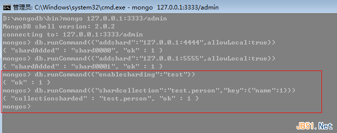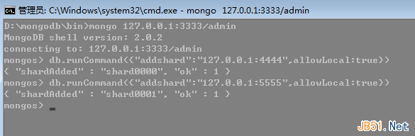 对分片来说,也就是要添加片了,这里开启E,F盘的mongodb,端口为:4444,5555。