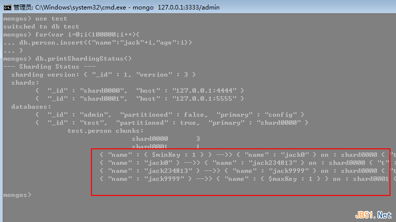 好了,至此我们的分片操作全部结束,接下来我们通过mongos向mongodb插入10w记录,然后通过printShardingStatus命令