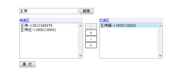 <form id="sel_form" action="post.php" method="post"> <p><input type="text" name="keys" id="keys" value="输入姓名或手机号码" onclick="this.value=''" /> <input type="button" id="searchOption" value="搜索" /> <span id="msg_ser"></span></p> <div id="sel"> <select name="liOption[]" id='liOption' multiple='multiple' size='8'> </select> </div> <input type="submit" value="提 交" /> </form>
