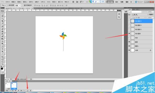 开始做动画,点击窗口动画,下面出来动画帧,如图所示,第一个风车图层眼睛是睁开的 ,其他风车图层眼睛闭上。