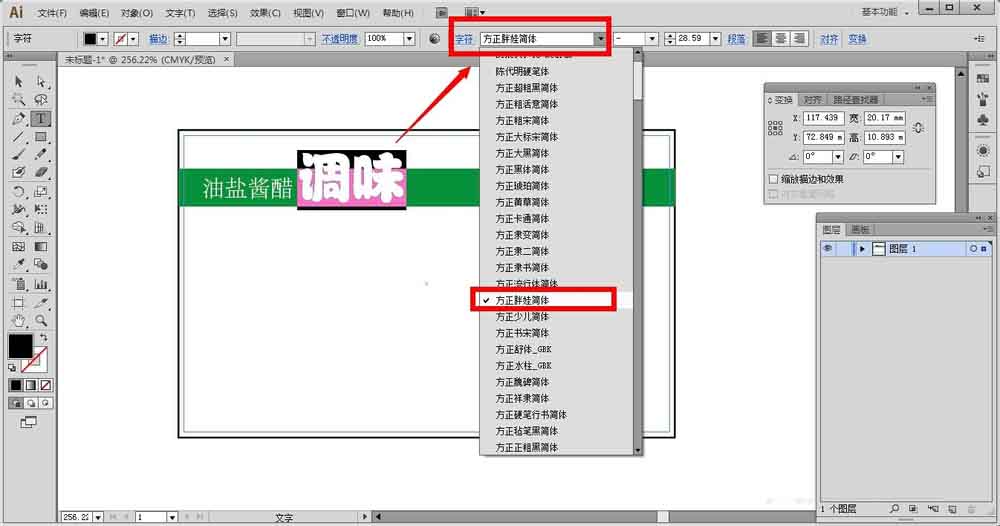 4、选中调味两个字,在字符面板里面,选择适合它的字体,最后粗一点的,比如方正胖娃简体