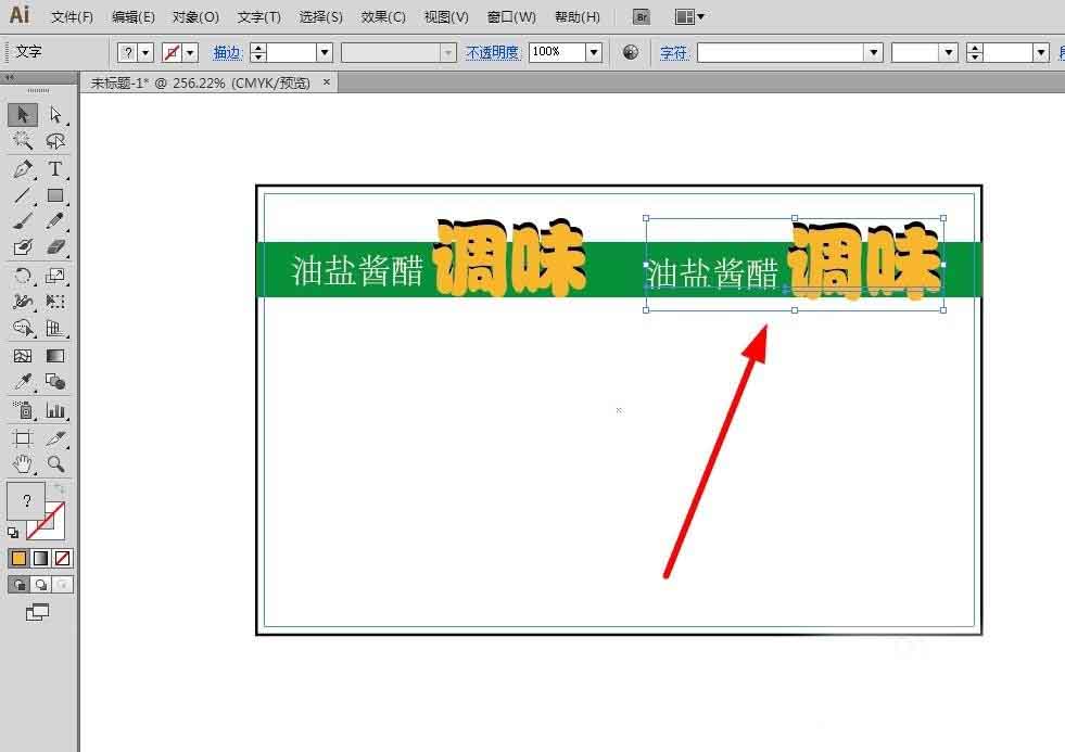 3、接着,把两个文字内容分别移动到绿色矩形的合适位置上,并且适当调节字距,大小,把“油盐酱醋”改成白色