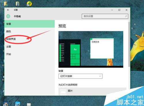 3.进入“个性化”之后,找到“锁屏界面”点击进入。这时我们可以看到背景下面有“幻灯片”可以选择。但是其实电脑的屏保幻灯片并不是在这里设置就可以,小编今天就是一直通过这个位置设置不成功。