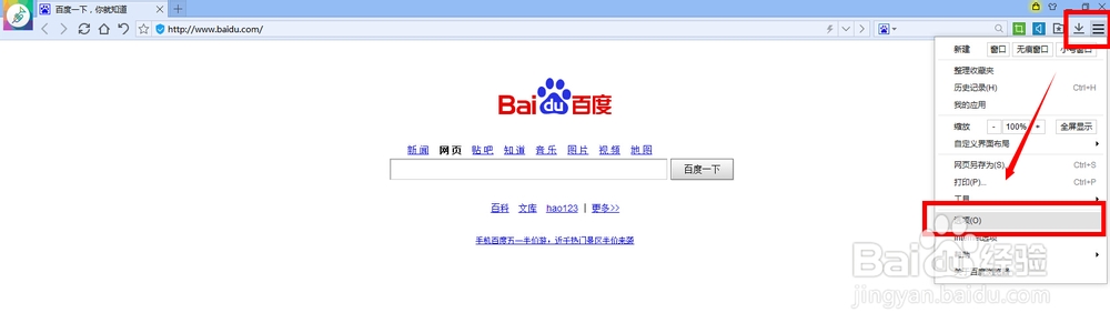 1, 在一些第三方浏览器当中其实本身就自带了设置默认浏览器的功能,比如说百度浏览器,打开后,在右上方有一个菜单标志,选择【选项】