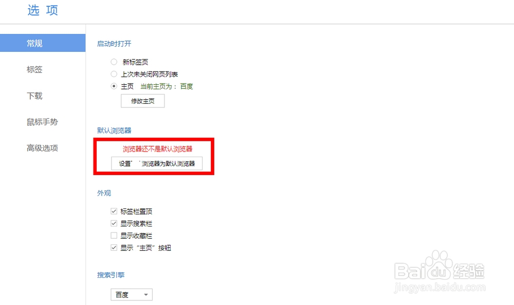 2,打开选项之后,在里面有一个【常规】选项,几乎每个第三方浏览器都是这样,里面会有一个【设置XX浏览器为默认浏览器】,点击一下就可以了。