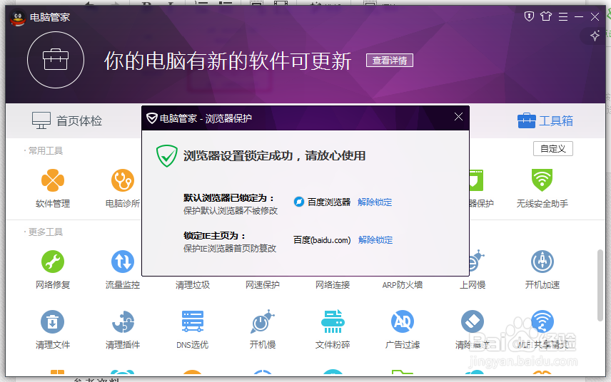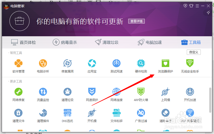 1,其实上面几种方式设置外,一旦有其他软件安装,默认浏览器还会自动修改,并不是固定的,想要固定默认浏览器,可以通过第三方软件解决,打开腾讯电脑管家——工具箱——浏览器保护。