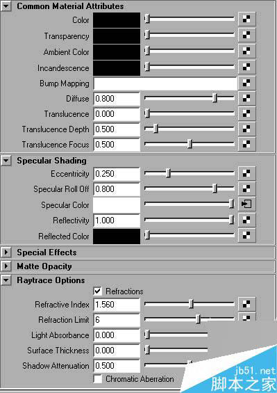 06现在开始做水,这里做得比较省了.只加了个费涅尔效应.不说了,开始做水,清空超图下方窗口,为水材质做准备.创建一个blinn,把属性调为如图,把颜色调为黑色,打开折射/反射属性,把折射率调为1.56。