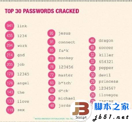 从图中可以看到,“link”是最容易被获取的密码,其次是“work”和“job”,宗教如“god”、“angel”、“jesus”也是流行的密码主题。另外,数字串“1234”和“12345”也榜上有名。
