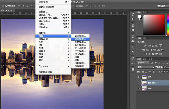 9、将两个倒影层合并。这里为何要多拷贝一个倒影层呢?设置动感模糊后,图像中的像素会发生位移,就会产生透明区域,这样与“天空”层的衔接位就不连贯了,并且上述提到动感模糊的参数设置足够就好,过大的话也会影响上下两图之间的拼合位过渡不自然。