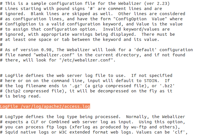 现在编辑Webalizer配置文件,为那里的Apache访问日志纠正路径。运行下面这个命令,即可使用Gedit编辑工具来编辑其配置文件。