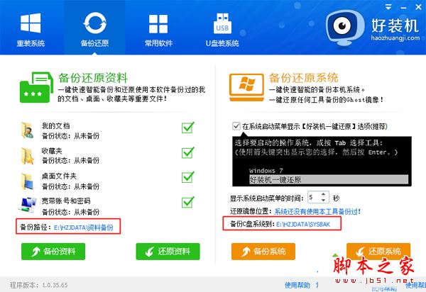 2、双击hzj.exe打开,如果需要备份可以在“备份还原”中备份当前电脑的系统和资料;