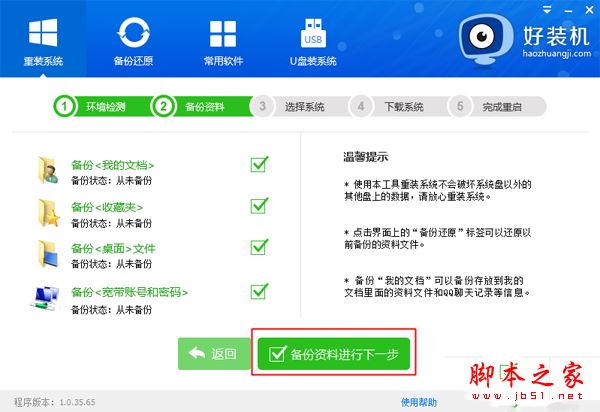5、勾选需要备份的项目,点击【备份资料进行下一步】;