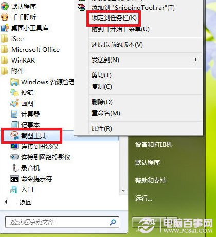 一:首先,单击“开始→所有程序→附件→截图工具”,就可以启动截图工具,你也可以在“开启”菜单搜索框中输入“截图工具”找到它,如果你经常需要截图,可以将它锁定到任务栏。以后直接单击任务栏“截图工具”按钮,即可启动截图工具。如图: