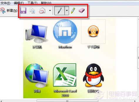 四:截取屏幕图像后,利用常用工具栏上的“笔”和“荧光笔”可以在图片上添加标注,用“橡皮擦”可以擦去错误的标注,单击“保存截图”按钮,可以将截图保存到本地硬盘,单击“发送截图”按钮,则可以将截取的屏幕图像通过电子邮件发送出去。如图: