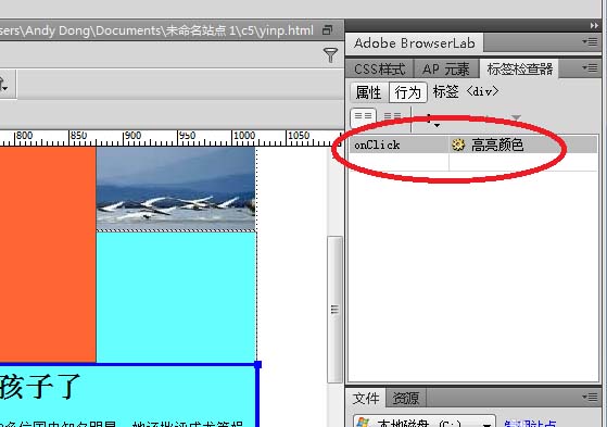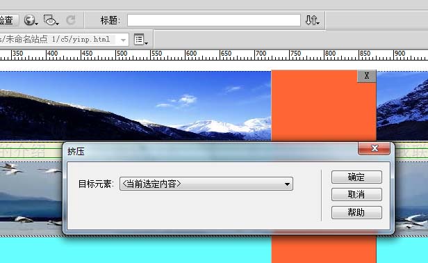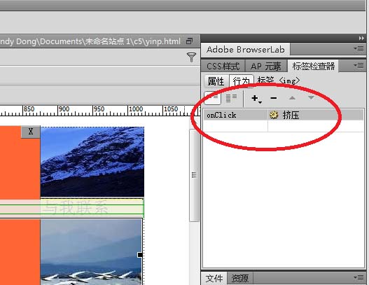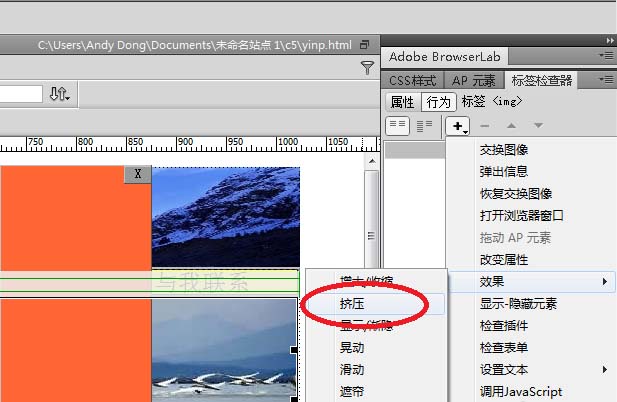 1、挤压,选中要挤压的图片,点击添加行为\效果\挤压,在弹出的对话框选择要挤压的图片,点击确定,把事件设置为onclick,即在网页中点击这张图片,该图即被挤压。