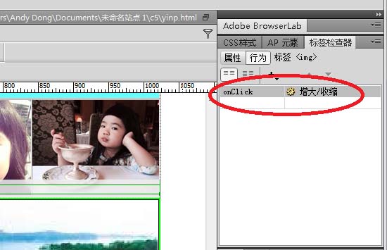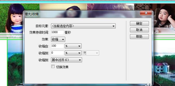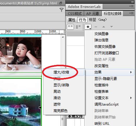 5、增大\收缩,选中图片,点击添加行为\效果\增大收缩。在弹出的对话框中按需求选择。调整事件为点击。