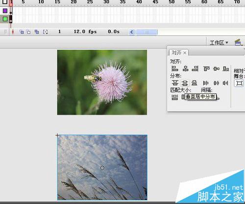 4、新建一层,将展示图,图1元件剪切至此层,我给该层取了个名字,图片层;原层就叫背景层。背景层里还有两张图片,将图2元件Delete键删除,暂时还用不着它。在对齐面板中将背景图宽度和高度居中,图片层中的图片也同样处理。