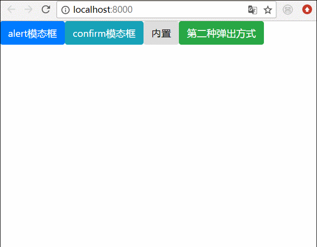 <div class="container"> <div class="row"> <button type="button" class="btn btn-primary" (click)="showAlert()">alert模态框</button> </div> </div>