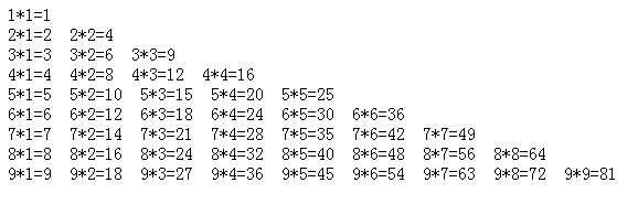 str+=i+"*"+j+"="+i*j+" ";