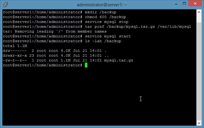 用 tar 备份 MySQL 数据文件时为了保持数据一致性,首先停用数据库服务器。备份会被写到 /backup 目录。