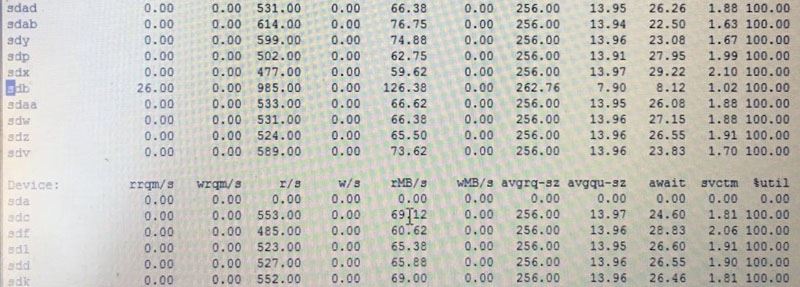 Device: rrqm/s wrqm/s r/s w/s rsec/s wsec/s avgrq-sz avgqu-sz await svctm %util sdg 0.00 0.00 133.00 0.00 2128.00 0.00 16.00 1.00 7.50 7.49 99.60