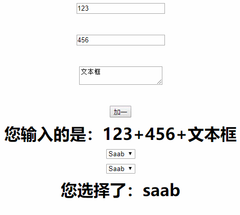 <h1>您输入的是:{{text1}}+{{text2}}+{{text3}}</h1>