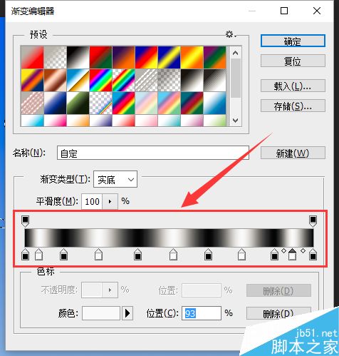(2)首先分别修改头尾两个色标的颜色均为黑色,然后再在渐变色上添加四个黑色色标,然后再在每两个黑色色标之间添加一个白色色标,这样渐变色上除了头尾两个黑色色标外,中间还有9个黑白相间的色标存在(见下图),注意中间的9个色标的相对位置不用做任何的调整,只要是分开的就可以了。