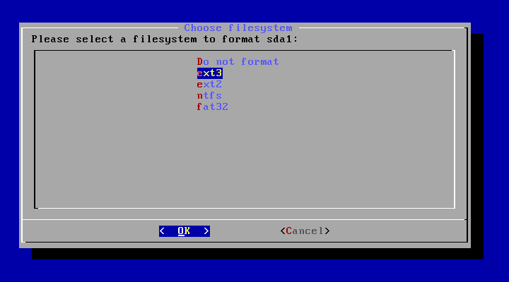 接下来是文件系统格式化,如果你安装与现有系统共存,你就选择 do not format,本例是选择ext3格式化