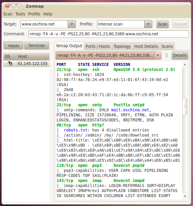 以上就是激情芒果最近收集整理的关于Ubuntu系统下安装使用网络扫描工具Zenmap的全部内容,更多相关Ubuntu系统下安装使用网络扫描工具Zenmap内容请搜索靠谱客的其他文章。