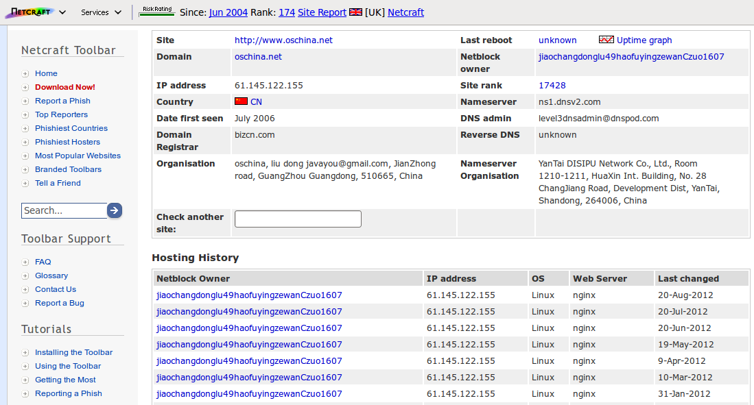 Firefox 装个 Netcraft Toolbar 已经能满足我们日常对网站服务器的简单窥探,下面看看 Netcraft 对我们的 OSC 社区探测结果: