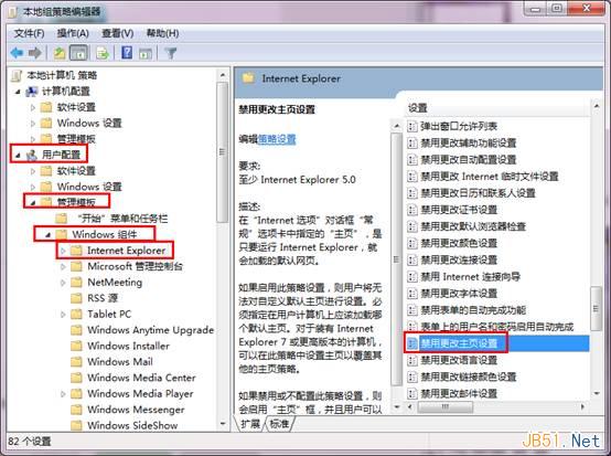 步骤二:用户配置---管理模块---Windows组件---Internet Explorer,然后打开右侧窗格中的“禁用更改主页设置”项;
