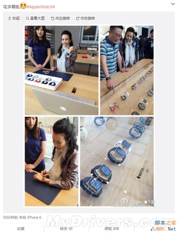 莫文蔚在个人微博中晒出了自己试戴的照片,并称“花多眼乱”。很显然是再说苹果Apple Watch款式太多,挑花眼了。