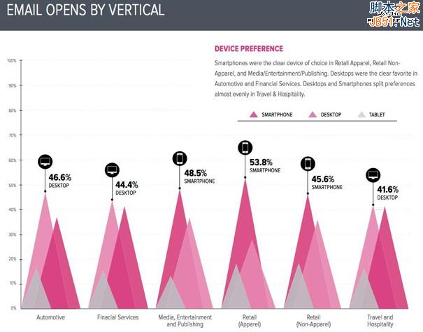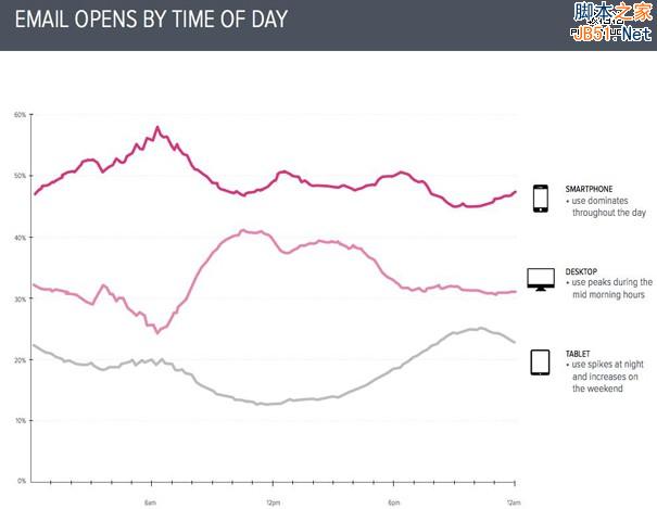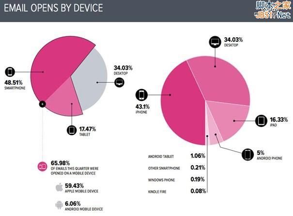 1.近一半的邮件通过智能手机打开,还有17%的邮件通过平板电脑打开,另外有34%的邮件通过PC端打开。手机与平板电脑的占比达2/3,而具体到邮件阅读的移动设备偏好度,报告还指出逾59%的邮件阅读是通过iOS设备。由此可见,智能手机和平板电脑构成了邮件阅读的重要媒介平台。