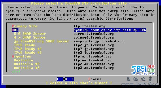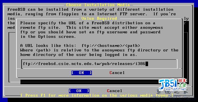 我们选择「URL」来自订要使用的 FTP 站台。接着便会出现一个要求我们输入站台地址的窗口,如图 10-5 所示,假设我们要使用交大资工的站台,则输入 freebsd.csie.nctu.edu.tw/pub/releases/i386/: