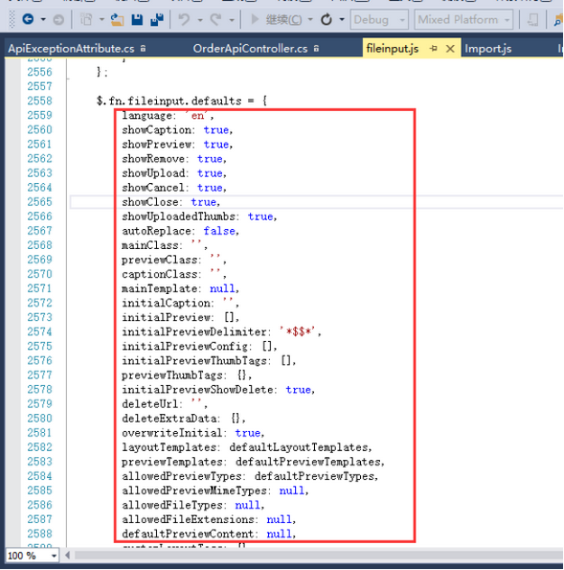 (1)fileinput()方法里面传入的是一个json数据,它里面有很多属性,每个属性代表着初始化上传控件的时候的特性,如果这些属性都不设置,则表示使用默认的设置。如果园友们想看看它里面有哪些属性,可以打开fileinput.js的源码,在它的最后如图: