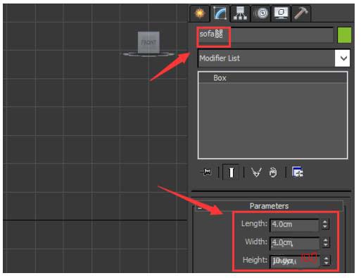 10、选择创建的box物体在modify里修改名字为sofa腿,并调节参数如图所示: