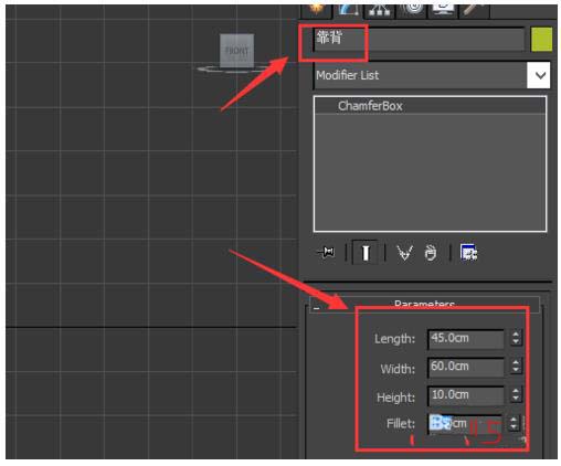 13、选择这个物体在modify里修改名字为靠背,参数修改如图所示,并调节其位置: