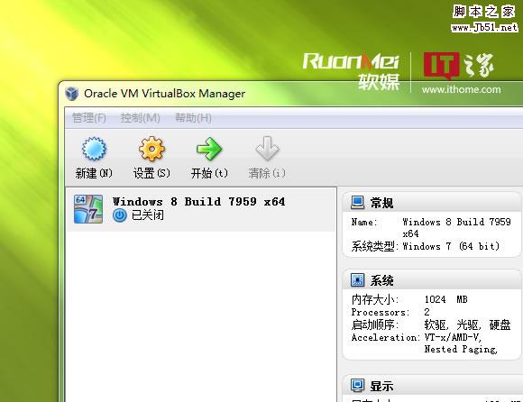 在完成上面的步骤后,Oracle VM VirtualBox Manager 里面就多了这个您指定名称为Windows 8 Build 7959 x64的虚拟机了——