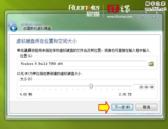 8、接下来的一步,是指定虚拟硬盘所在位置和空间大小,这儿有必要提醒大家一下,如果你当初把VirtualBox安装在C盘,它会默认把虚拟机占用的文件也放到C盘,而在这一步,你可以点击位置右面的那个资源管理器图标按钮,指定你存放虚拟机硬盘文件的位置,例如 D:\VirtualBox\ 等路径下。安装Win8或者Win7后,虚拟机文件可能达到10多G,所以,这一步根据你的硬盘空间情况,自行决定。