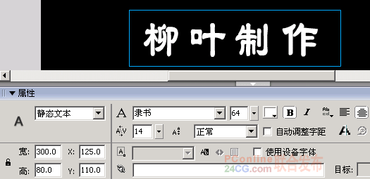 2.按快捷键Ctrl+F8新建一个名为“文字”的图形元件。点选“工具”面板中的“文本”工具,在该元件的场景中拉一个静态文本框,并输入“柳叶制作”四个字。点选输好的文字,如图1所示设置其“属性”面板。