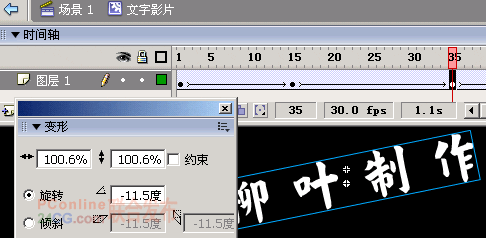 4.点选“文字”层的第15、35、50、90、150、215帧,按F6键插入关键帧。点选第15、35、50、90、150帧中“文字影片”元件,将它们进行移动,并按快捷键Ctrl+T打开“变形“面板改变其角度,见图2所示。其目的是让该元件能够进行上下左右晃动。