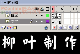 8.回到“场景 1”,如图5所示建立“脚本”、“文字”两层,各4帧。把电影剪辑“文字颜色”元件从“库”面板中拖拽到“文字”层的场景中。