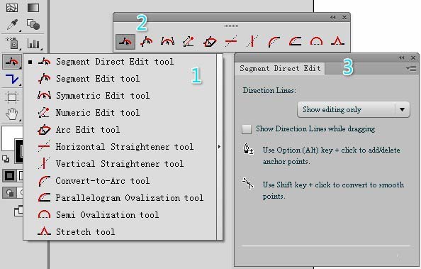2、路径直接编辑工具(Segment Direct Edit tool),选中路径,再点选本工具,可以进行以下几种操作: