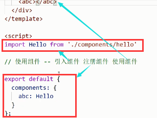 在一个组件中使用另一个组件三部曲:引入组件、注册组件、使用组件