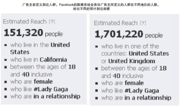 以LadyGaGa为例来做简单的说明:在美国加州喜欢LadyGaGa的女性约有15万人,而加入英国以后,喜欢LadyGaGa的女性人数大幅增加到近2百多万人。如此一来,如果广告商想针对喜欢LadyGaGa这类表演或歌手的受众打广告时,对于受众群的人数就有了大概的了解。假设产品是能量饮品(类似红牛一类的饮品)的话,还可以进一步针对喜欢运动(#sport)和冒险(#adventure)的Facebook用户,甚至将红牛等能量饮品的粉丝页设定为受众条件。