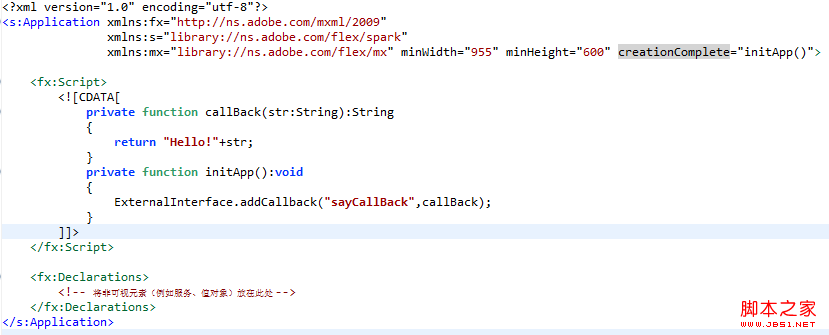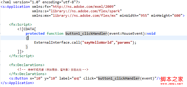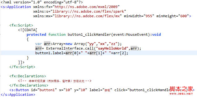继续使用刚才的项目,直接在上面做修改。将FlexToJs.mxml改为如下:
