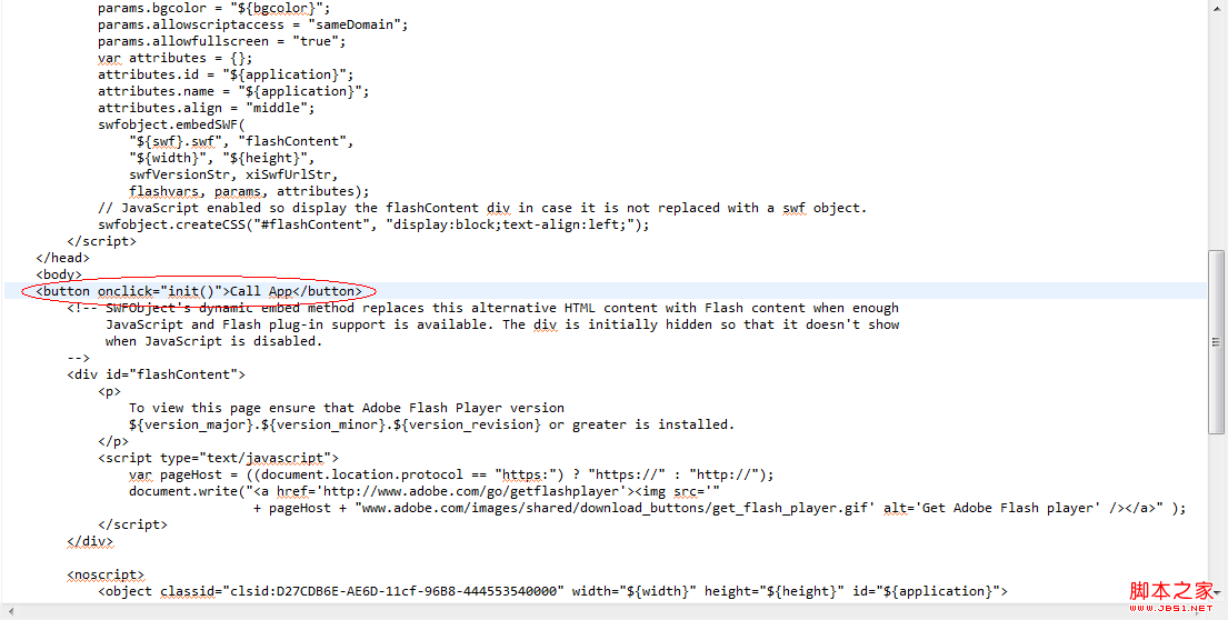 Felx调用js其实就是使用的方法ExternalInterface.call()。主界面添加一个按钮,并且注册一个点击事件,如图: