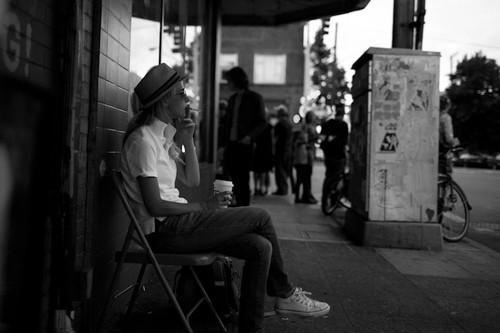 街拍不是用长焦在远处偷拍。在街拍里,拍摄者不是隐形的,被拍者会看到你。使用长焦镜头偷拍会让你看起来鬼鬼祟祟的。使用50mm在近处拍摄会比200mm的镜头在远处拍得到更好的反馈。我个人经常使用一只35mm的镜头。定焦头的好处是比较小,你经常可以使用它靠近拍摄而不被发现。即时你征求某个人同意后拍摄,它也比拿着只大炮冲着他们脸拍好。