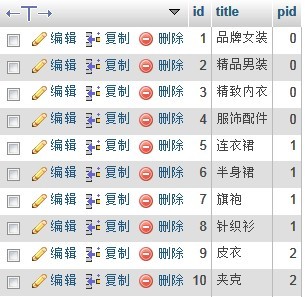 首先我们准备一张数据表class,记录商品分类信息。表中有三个字段,id:分类编号,主键自增长;title:分类名称;pid:所属上级分类id。