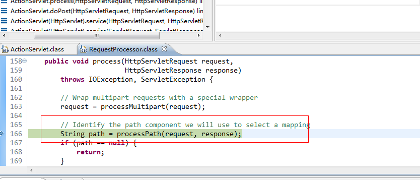 这一段代码是判断javax.servlet.include.servlet_path是否存在值,这个也是当一个页面是以equestDispatcher.include方式显示的话,这个属性值才存在,所以这里的值没有。之后进入path = request.getServletPath();这个方法是获得返回请求URI上下文后的子串,所以这里的返回值就是“/”和访问页面名称和后缀(这里和我的mvc实例截取的是不是一样的道理)。随后进入下面代码:
